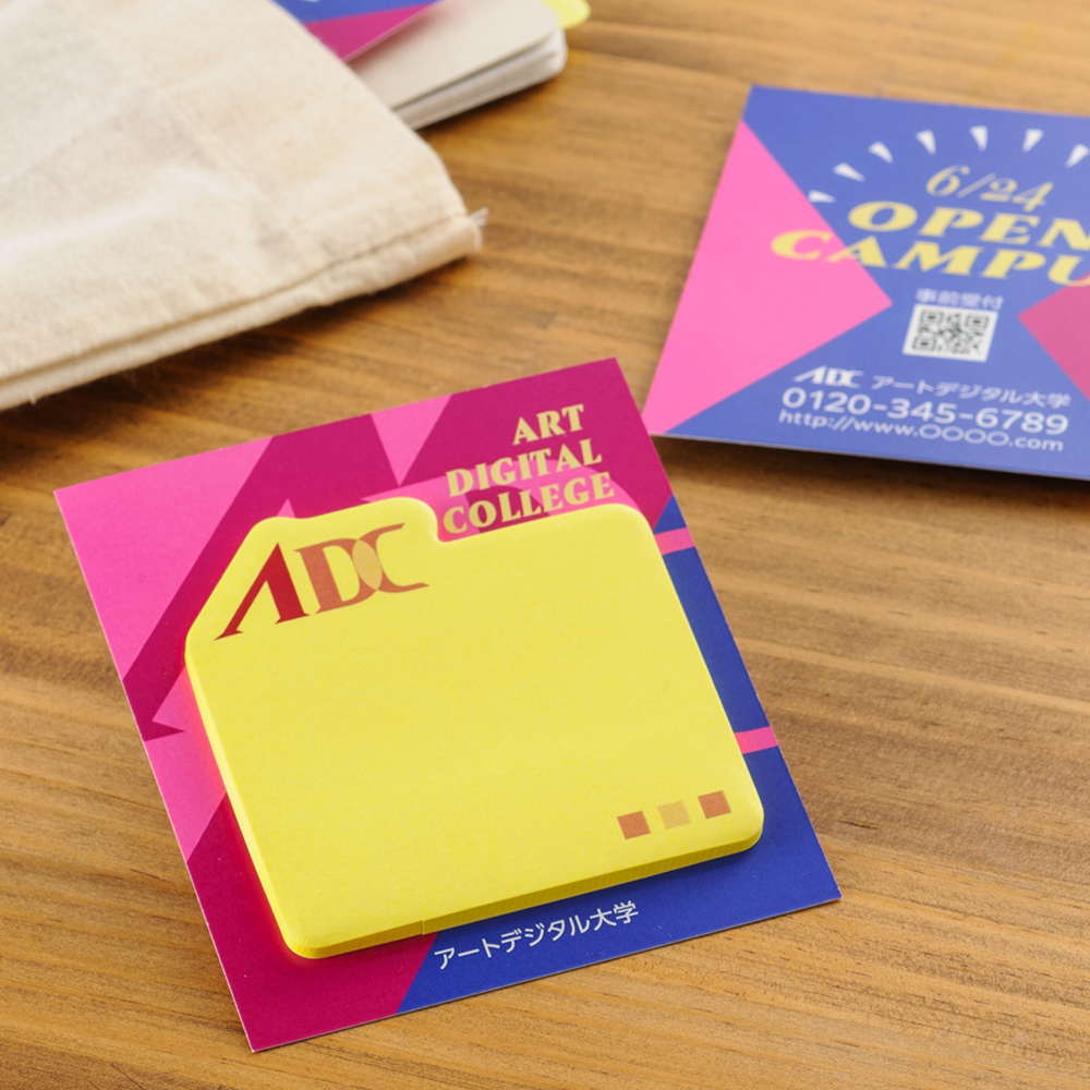 W65×H65mm以内でオリジナル形状ふせんが製作できる台紙付きダイカットふせん。台紙にもオリジナルデザインや名入れ印刷が可能で、企業ノベルティや展示会・イベント配布に最適。短納期・小ロット対応もできる販促効果の高いオーダーメイドふせんです。