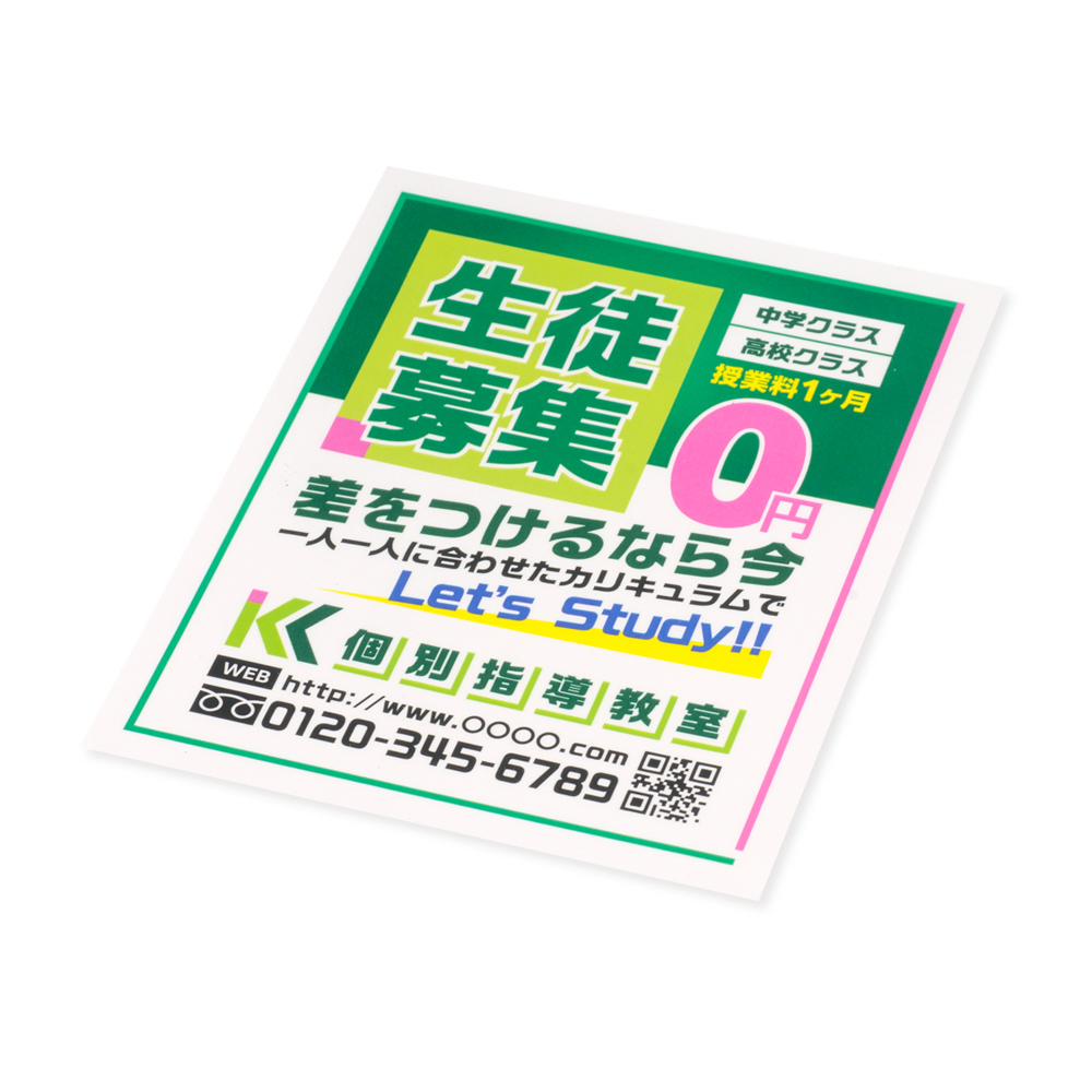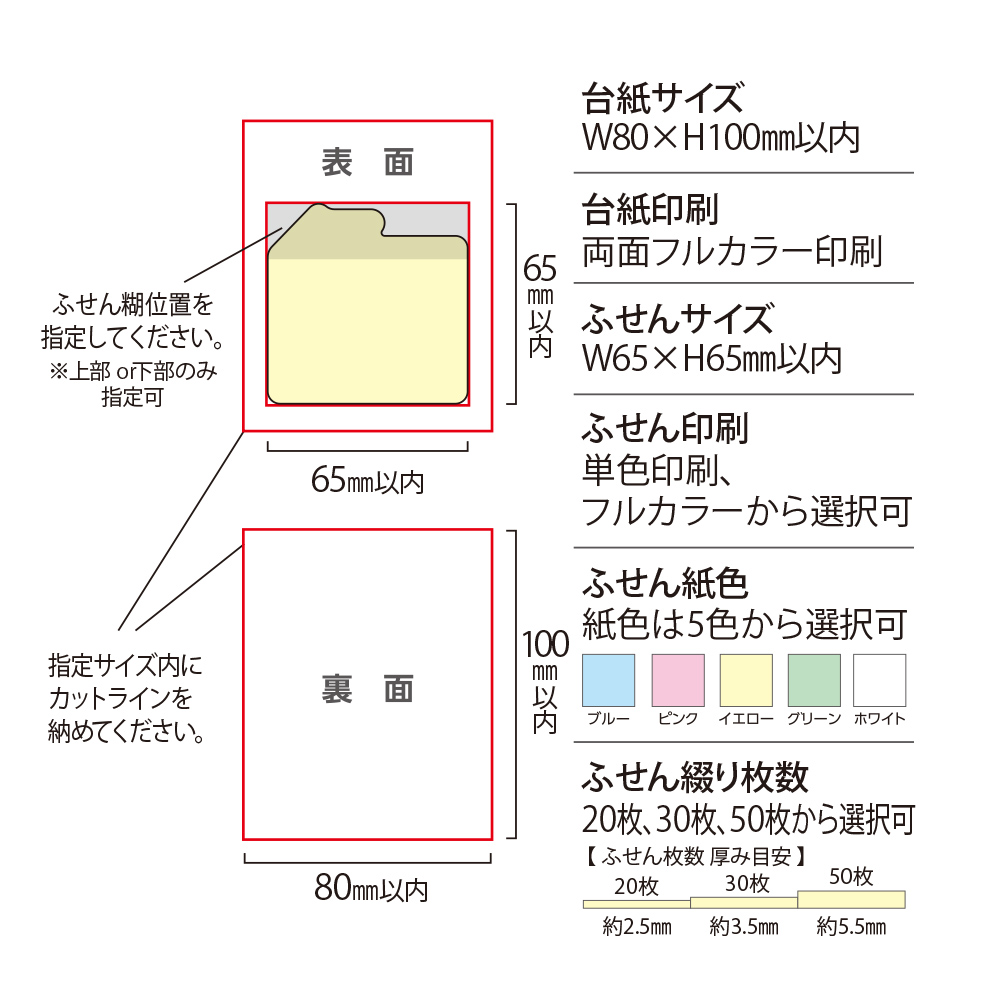 商品名 オリジナル型抜き 台紙付ダイカットふせん W65xH65mm以内 ふせん紙サイズ W65xH65mm以内 ふせん紙用紙 色上質中厚口 ふせん紙綴り枚数 20,30,50枚綴りから選択可 ふせん紙色 ホワイト,グリーン,イエロー,ブルー,ピンクから選択可 ふせん紙本体 紙色についてふせん紙印刷色 片面(スミ1色/カラー1色/フルカラー)印刷から選択可 ふせん紙印刷方法 オンデマンド印刷 ふせん紙加工 型抜き加工 台紙サイズ W80xH100mm以内から選択可 台紙用紙 アートポスト220kg 台紙紙色 ホワイトのみ 台紙印刷色 両面フルカラー印刷 台紙印刷方法 オンデマンド印刷 包装 OPP個装 テンプレート ダウンロード 納期 【通常納期】