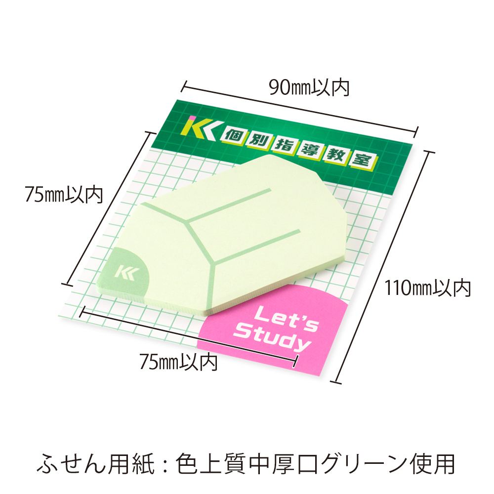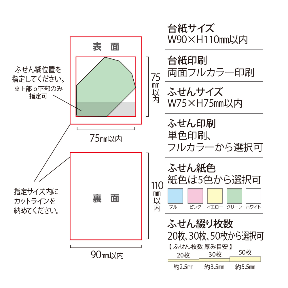 商品名 オリジナル型抜き 台紙付ダイカットふせん W75xH75mm以内 ふせん紙サイズ W75xH75mm以内 ふせん紙用紙 色上質中厚口 ふせん紙綴り枚数 20,30,50枚綴りから選択可 ふせん紙色 ホワイト,グリーン,イエロー,ブルー,ピンクから選択可 ふせん紙本体 紙色についてふせん紙印刷色 片面(スミ1色/カラー1色/フルカラー)印刷から選択可 ふせん紙印刷方法 オンデマンド印刷 ふせん紙加工 型抜き加工 台紙サイズ W90xH110mm以内から選択可 台紙用紙 アートポスト220kg 台紙紙色 ホワイトのみ 台紙印刷色 両面フルカラー印刷 台紙印刷方法 オンデマンド印刷 包装 OPP個装 テンプレート ダウンロード 納期 【通常納期】