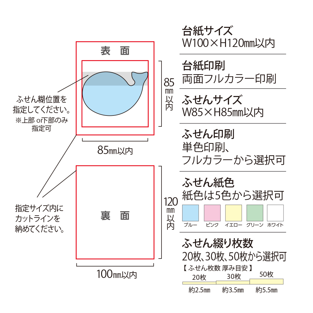 商品名 オリジナル型抜き 台紙付ダイカットふせん W85xH85mm以内 ふせん紙サイズ W85xH85mm以内 ふせん紙用紙 色上質中厚口 ふせん紙綴り枚数 20,30,50枚綴りから選択可 ふせん紙色 ホワイト,グリーン,イエロー,ブルー,ピンクから選択可 ふせん紙本体 紙色についてふせん紙印刷色 片面(スミ1色/カラー1色/フルカラー)印刷から選択可 ふせん紙印刷方法 オンデマンド印刷 ふせん紙加工 型抜き加工 台紙サイズ W100xH120mm以内から選択可 台紙用紙 アートポスト220kg 台紙紙色 ホワイトのみ 台紙印刷色 両面フルカラー印刷 台紙印刷方法 オンデマンド印刷 包装 OPP個装 テンプレート ダウンロード 納期 【通常納期】