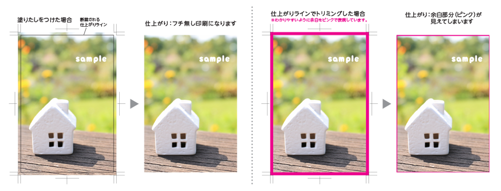 これは、印刷時に大きな用紙に印刷してから仕上がりサイズに切るので、切った時のズレの影響で仕上がり内に紙の色がでないようにするための必須作業です。