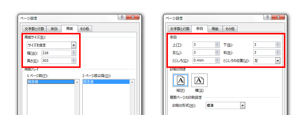例えばA4サイズの場合、「用紙タブ」で規格サイズ210mm×297mmに上下左右3mmずつ足した、216mm×303mmにサイズを設定します。