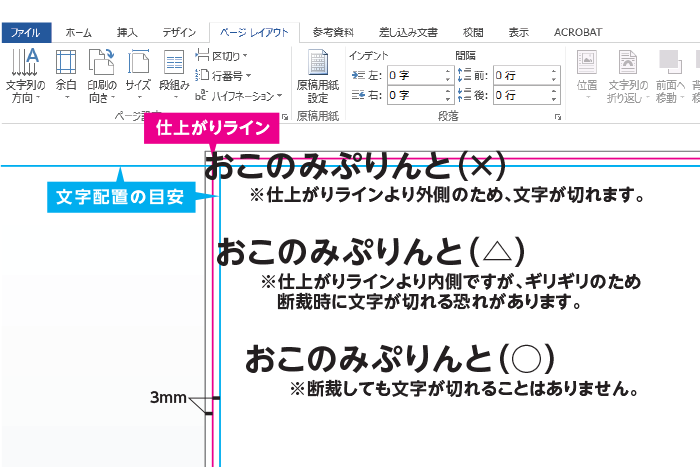文字や絵柄が印刷物の端までデザインされている場合、カットすると切れてしまう恐れがございます。切れて困る文字やオブジェクトは、仕上がり(断裁)線より3mmほど内側にレイアウトするようにお願いします。