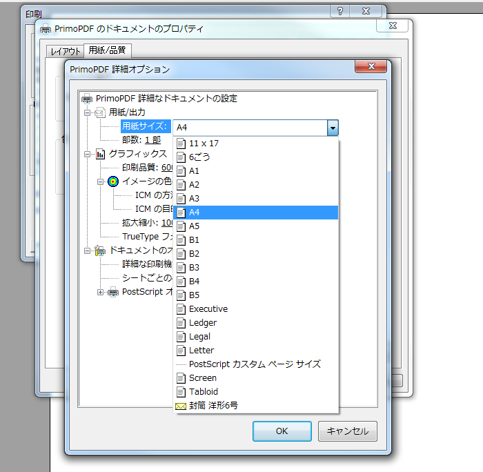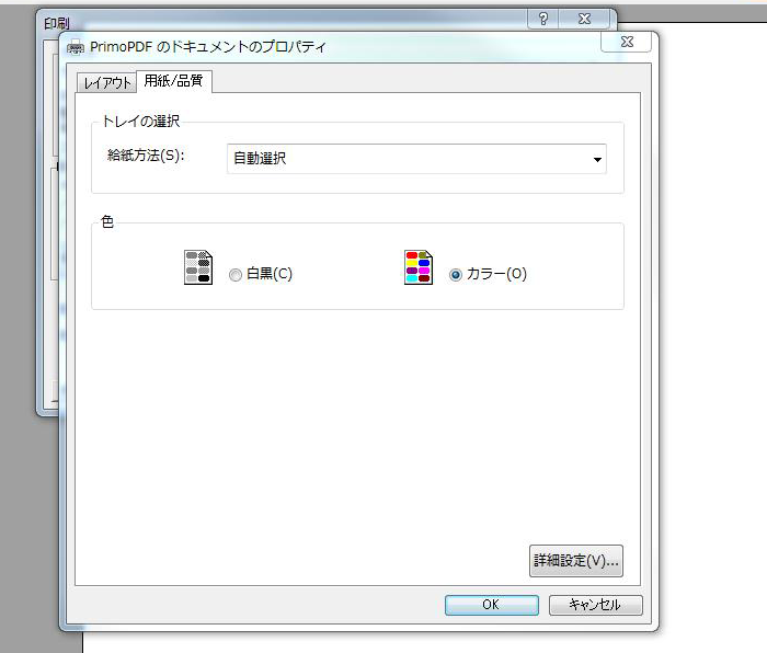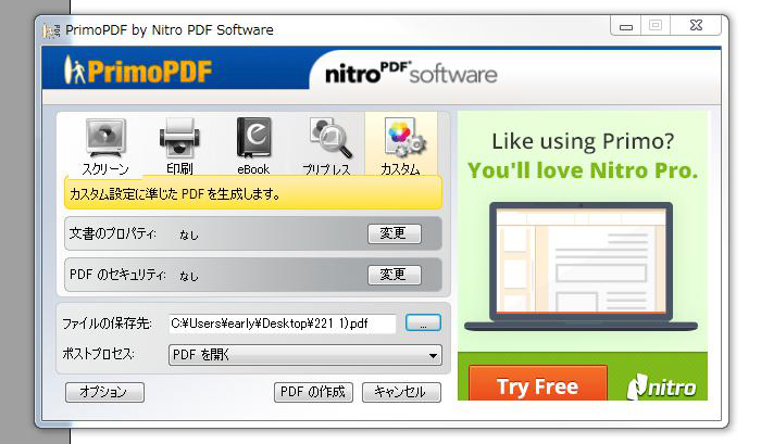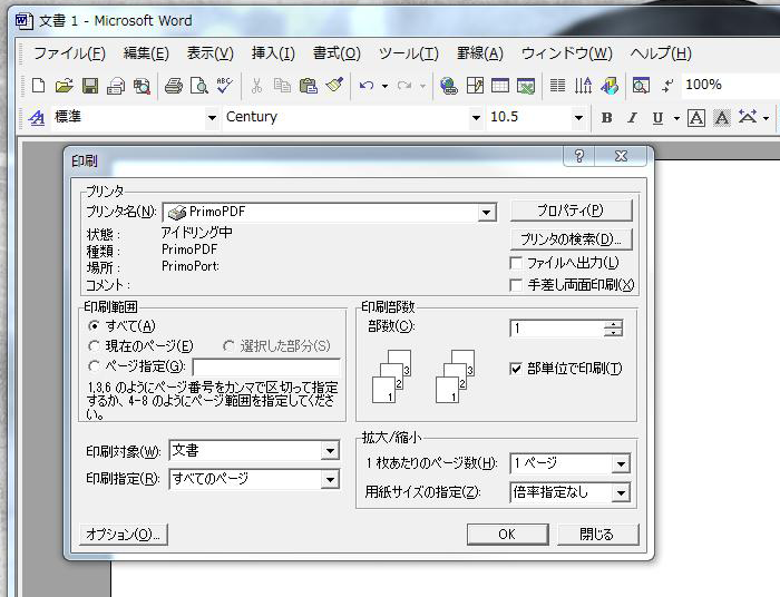 • 1. ファイル→印刷→プリンタ名を「PrimoPDF」に変更→プロパティ