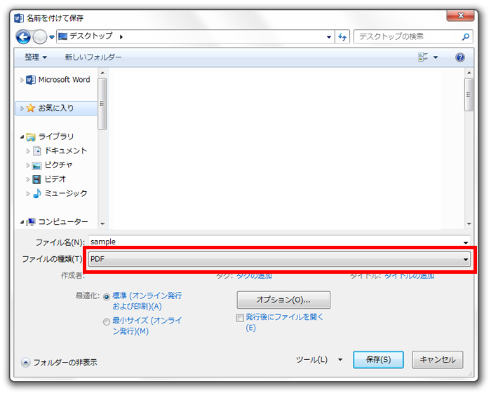 保存場所とファイル名(任意)を決定してください。ファイルの種類の項目が「PDF(*.pdf)」となっているのを確認してから、「オプション」をクリックしてください。