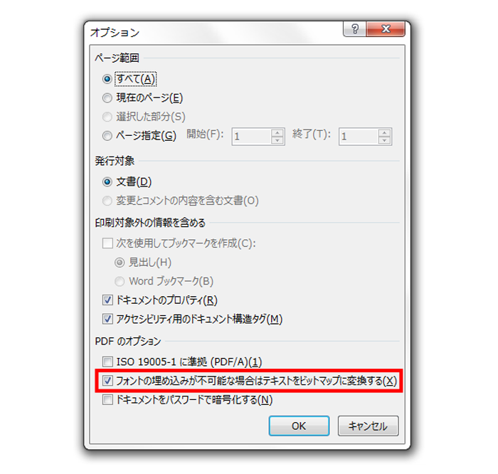 • wordの場合、オプションの「フォントの埋め込みが不可能な場合はテキストをビットマップに変換する」には必ずチェックを入れてください。PDFに埋め込みができないフォントを使用していた場合に、文字をビットマップ(画像)に変換します。